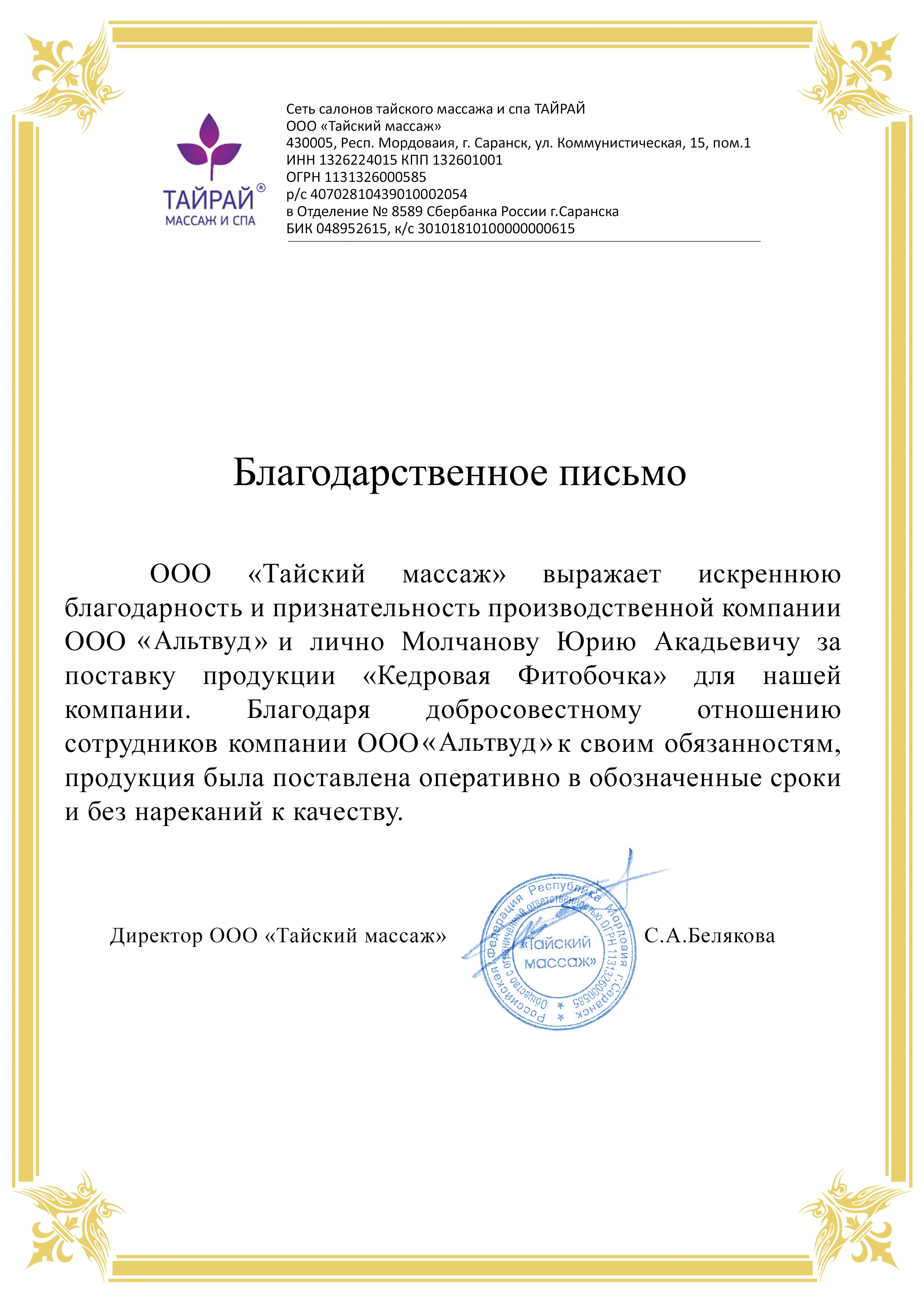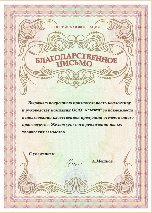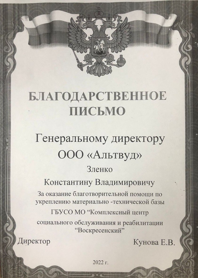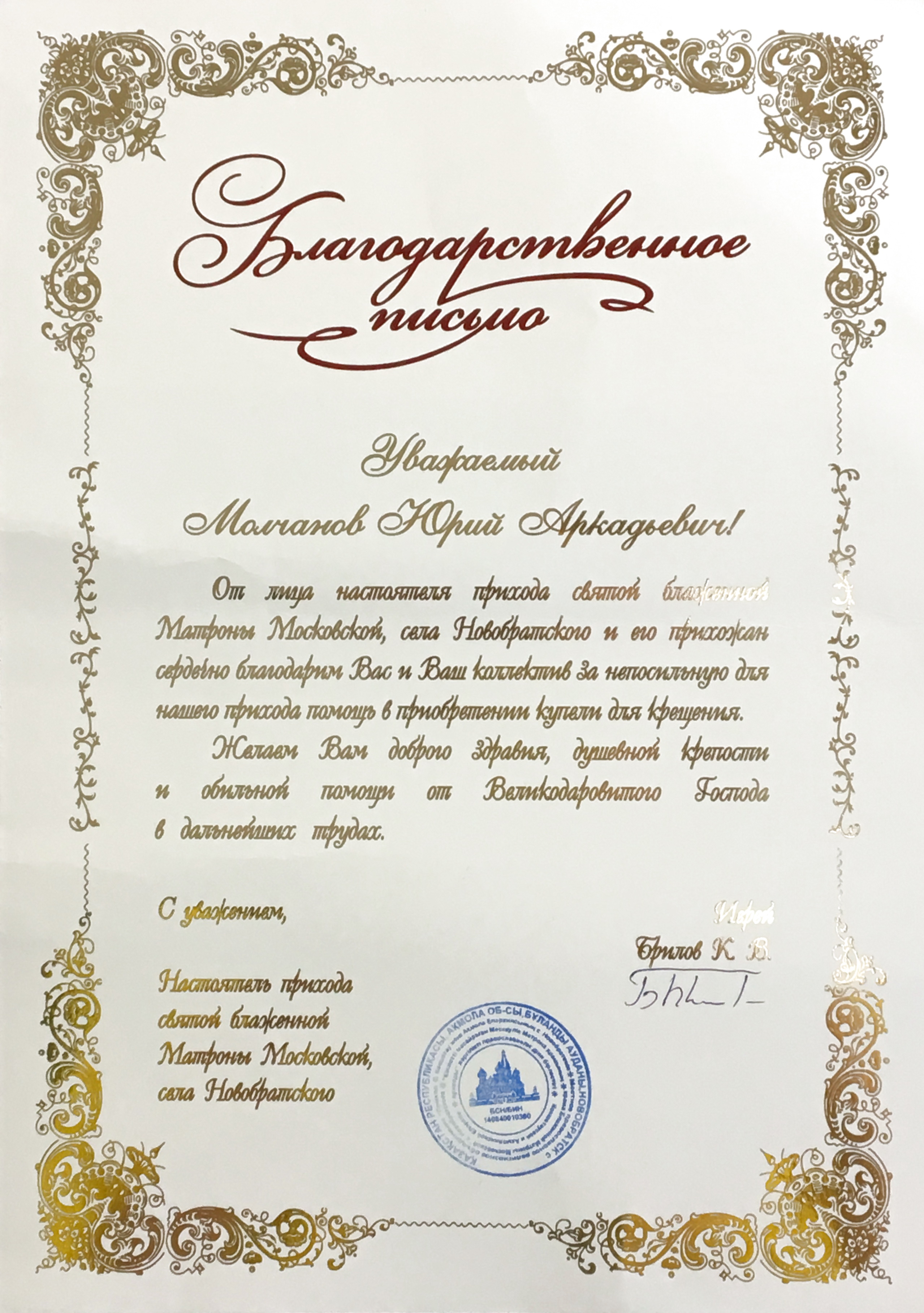 Благодарственное письмо от Храма Дмитрия Донского г. Пенза